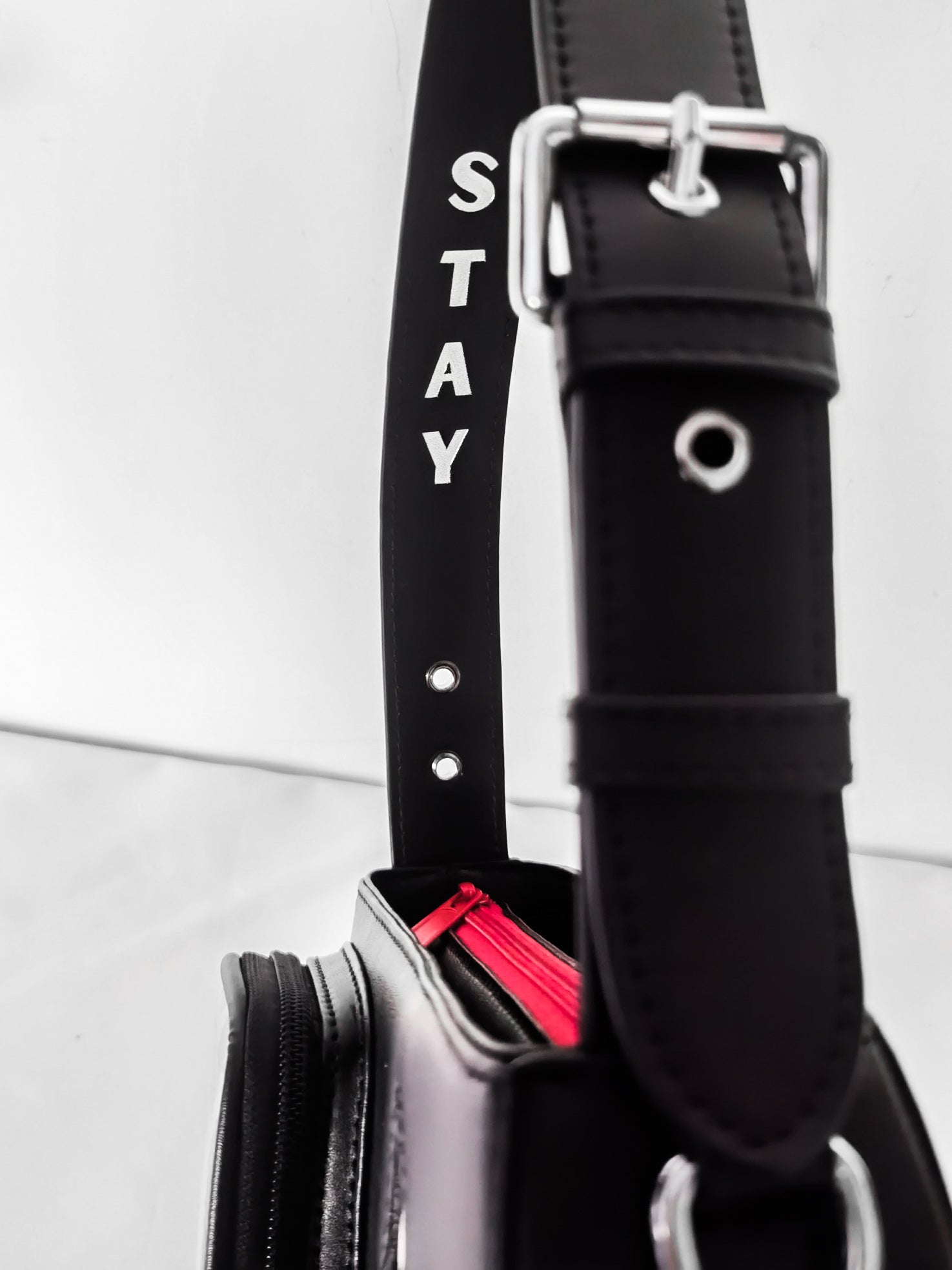 - STAY embossed lettering on inside strap